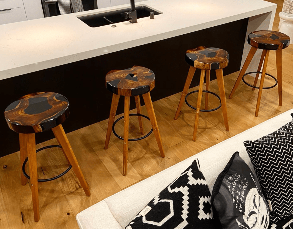 Back to the work adventure in LA…I continued working in production in Los Angeles for many production companies, for Netflix, and even though it seemed from the outside that I was successful, I didn’t feel happy. 2020. The pandemic hit. And like most in production, the work stopped. The pandemic was also a time when I discovered woodworking. The opportunity came from one of my wife’s art clients who randomly asked her if she could take her resin art work and apply it to creating a set of bar stools that would combine resin and wood. She brought the project to me, knowing I had unexpected time on my hands, and I said “why not?” I had no business taking the project on, but I did have time. And I did have an adventurous spirit.